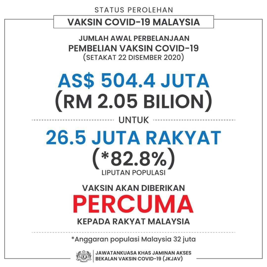 科学、工艺及革新部长凯里指出,政府考量与多家制药厂签署疫苗采购协议,及目前正在敲定采购协议后,大马将以20亿5000万令吉的价格,为国内近83%或相等于2650万人口提供疫苗。