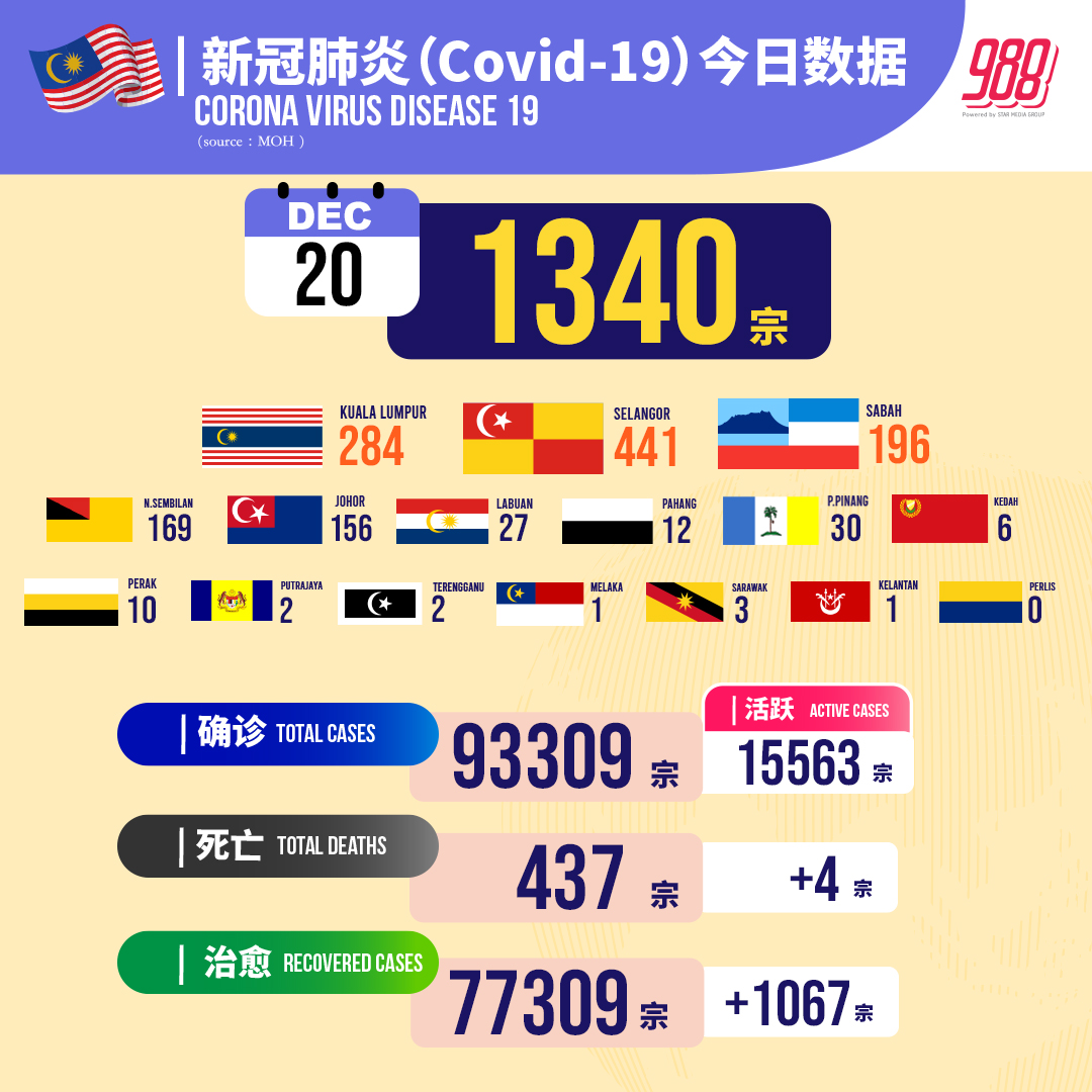卫生部通报,截至20日12pm,我国新增 #1340例,累计病例至今 #93309 宗, 4死累计 #437死。