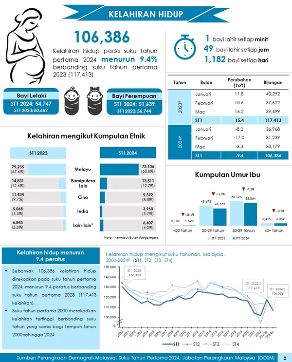 数据显示,马来人出生率从去年同时期的67.6%增至68.8%(即7万3136名婴儿)华裔与印裔,去年同期出生率是9.7%及4.3%,分别降至8.8%和3.7%。
