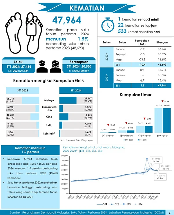 死亡人数方面,今年首季共有4万7964人死亡,雪州死亡人数最多,多达7730人,布城死亡人数最少,为68人。