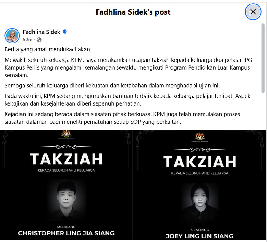 与此同时,教育部长法丽娜也在脸书发帖说,两名学生是参加“校外教育课程”(Program Pendidikan Luar Kampus)时发生意外,执法当局正对这起事件调查。