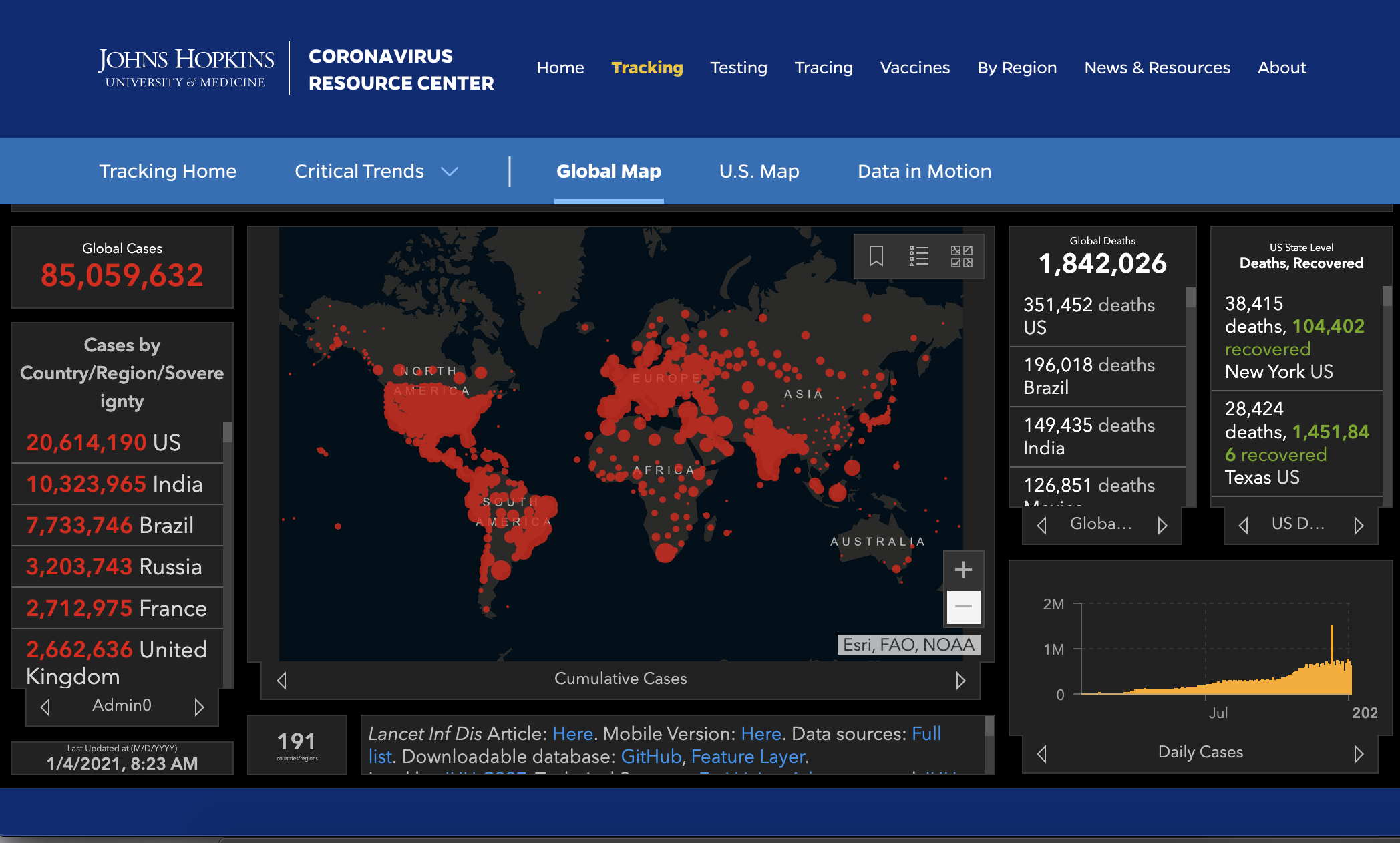 ➡️疫情肆虐全球至少 #191国/地区,截至今早8.23am,美国约翰斯·霍普金斯大学实时统计:全球累计确诊病例85,059,632例,累计死亡1,842,026例。