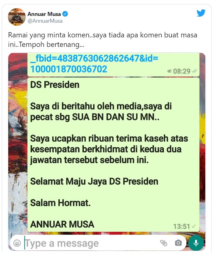 随着传出国阵主席阿末扎希出手革职消息后,安努亚通过推文证实自己被革职,并指他暂时无话要说,需要一点时间来冷静。