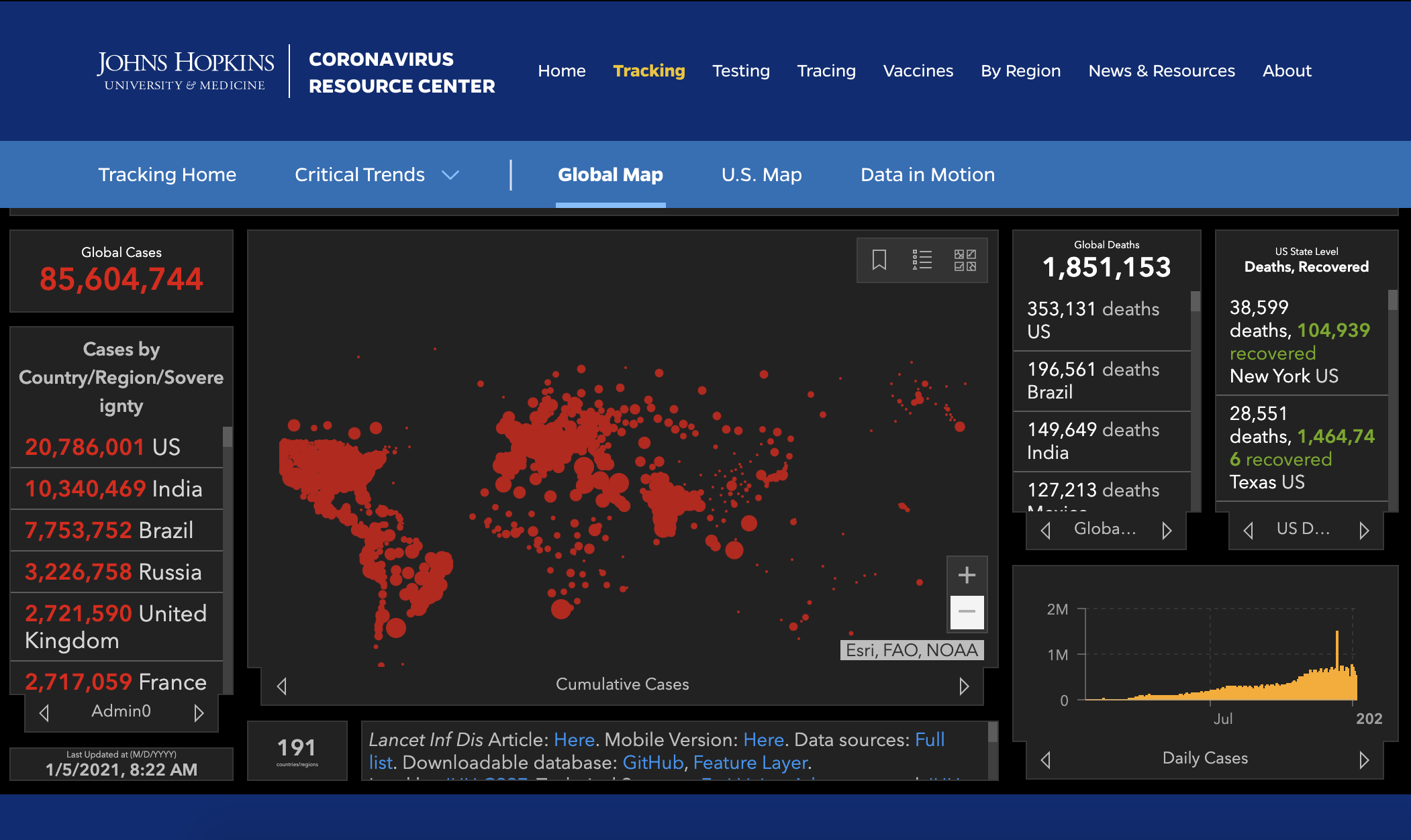 ➡️疫情肆虐全球至少 #191国/地区,截至今早8.22am,美国约翰斯·霍普金斯大学实时统计:全球累计确诊病例85,604,744例,累计死亡1,851,153例。