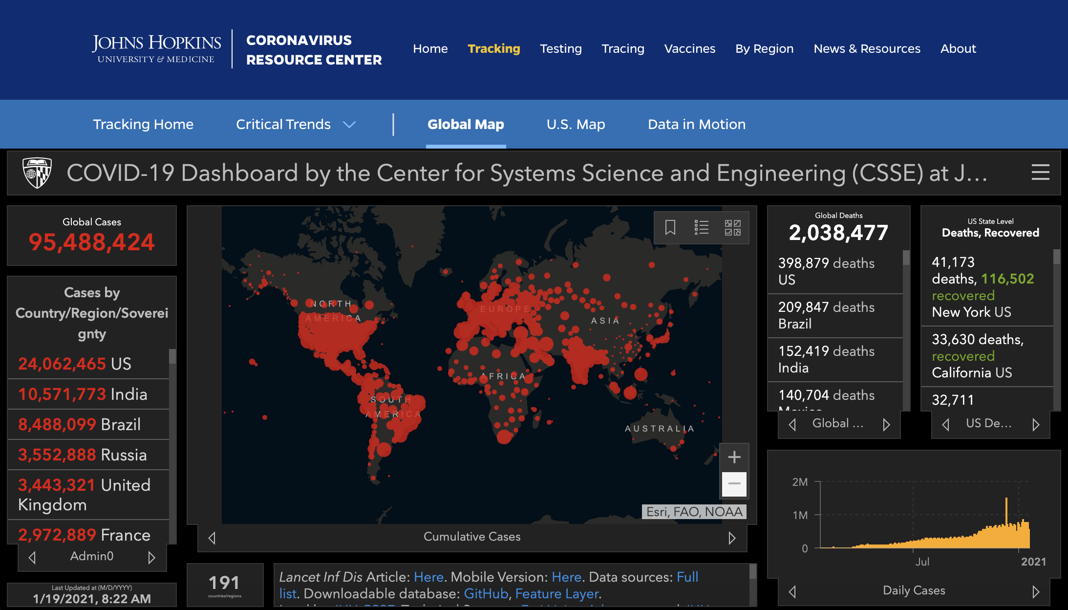 ➡️疫情肆虐全球至少 #191国/地区,截至今早8.22am,美国约翰斯·霍普金斯大学实时统计:全球累计确诊病例95,488,424例,累计死亡2,038,477例。