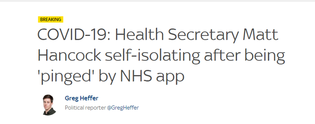 ➡️英国卫生大臣汉考克社媒上说,他曾接触确诊者,被通知必须自行隔离6天。他表示是收到公卫系统通过疫情app发来通知,需居家隔离至24日。汉考克曾在去年3月染疫,治疗后康复。