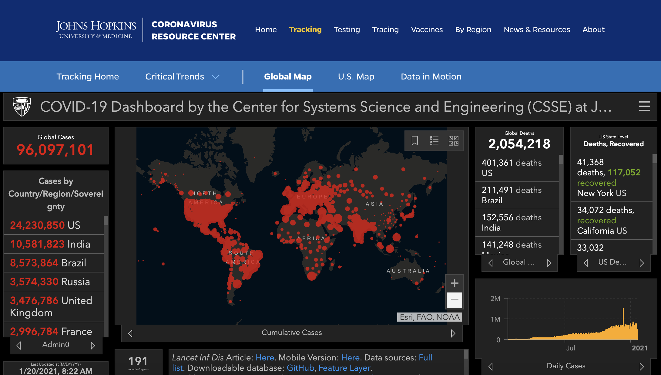 ➡️疫情肆虐全球至少 #191国/地区,截至今早8.22am,美国约翰斯·霍普金斯大学实时统计:全球累计确诊病例96,097,101例,累计死亡2,054,218例。