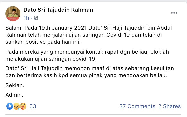 巫统硝山区国会议员纳兹里昨日确诊,而曾与他接触的巫统最高理事达祖丁表明他会马上检测,而筛检结果出炉证实是阳性!