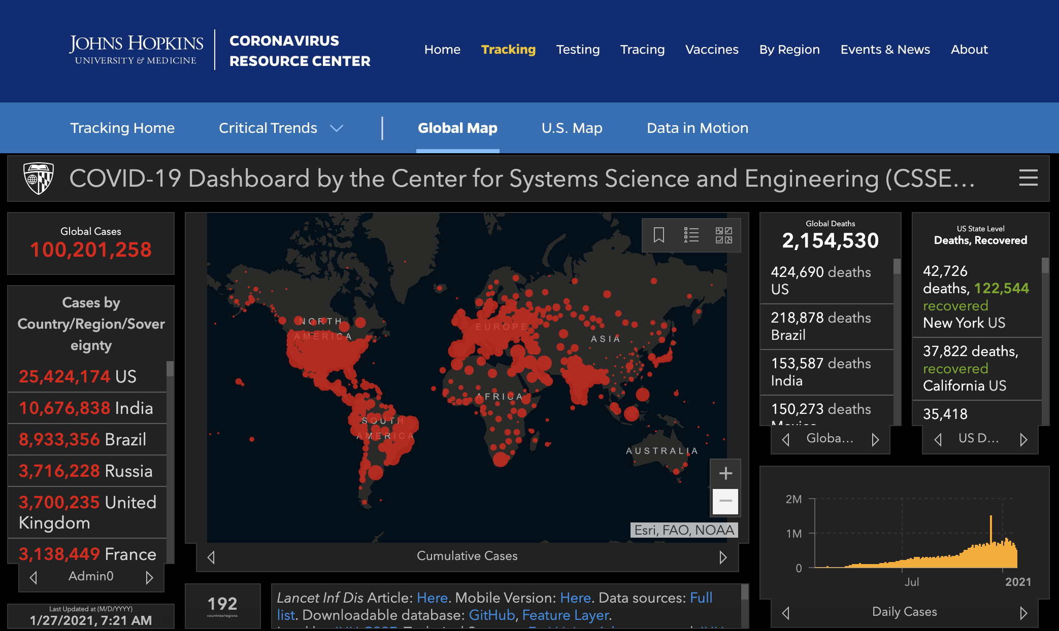 ➡️疫情肆虐全球至少 #192国/地区,截至今早7.21am,美国约翰斯·霍普金斯大学实时统计:全球累计确诊病例100,201,258例,累计死亡2,154,530例。