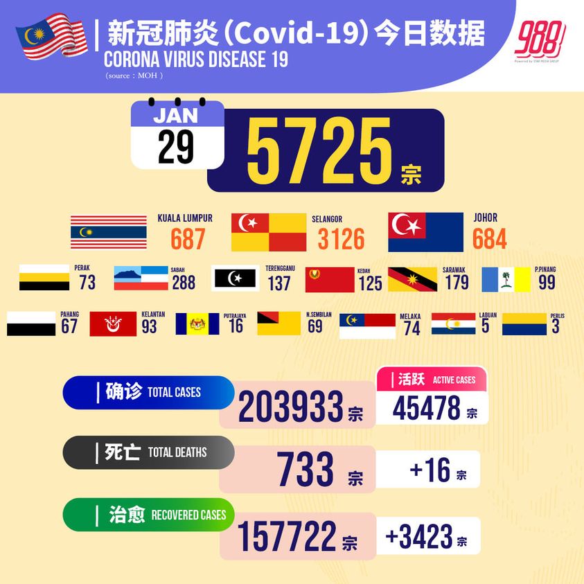 卫生部通报,截至29日12pm,我国新增 # 5725 例,累计病例至今 # 203,933 宗, 16死累计 #733死。