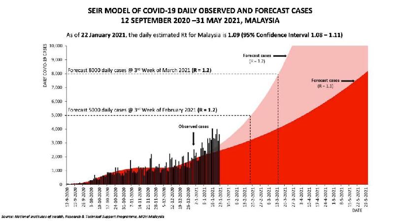 📌卫生总监诺希山说,今天单日新增破5000宗,比卫生部之前预测2月第3周的预期数据,提早了整整3星期。他上载SEIR传染病动力学模型,显示基染数达到1.2,2月第3周将达5000确诊。