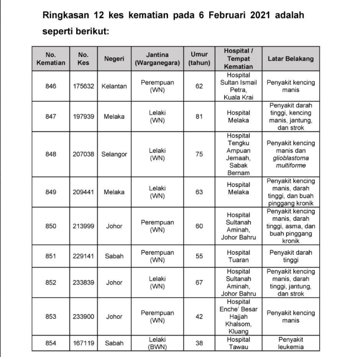 📌今天有12人死,分别来自雪州(1)、马六甲(2)、吉兰丹(1)、吉隆坡(2)、柔佛(3)及沙巴(3)。死者资料如下:
