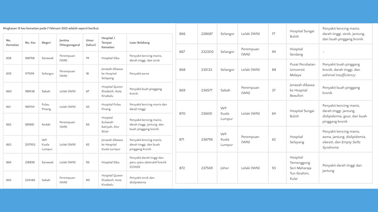 📌今天有15人死,分别来自雪州(4)、砂州(2)、槟城(1)、吉打(1)、吉隆坡(3)、柔佛(1)及沙巴(3)。死者资料如下: