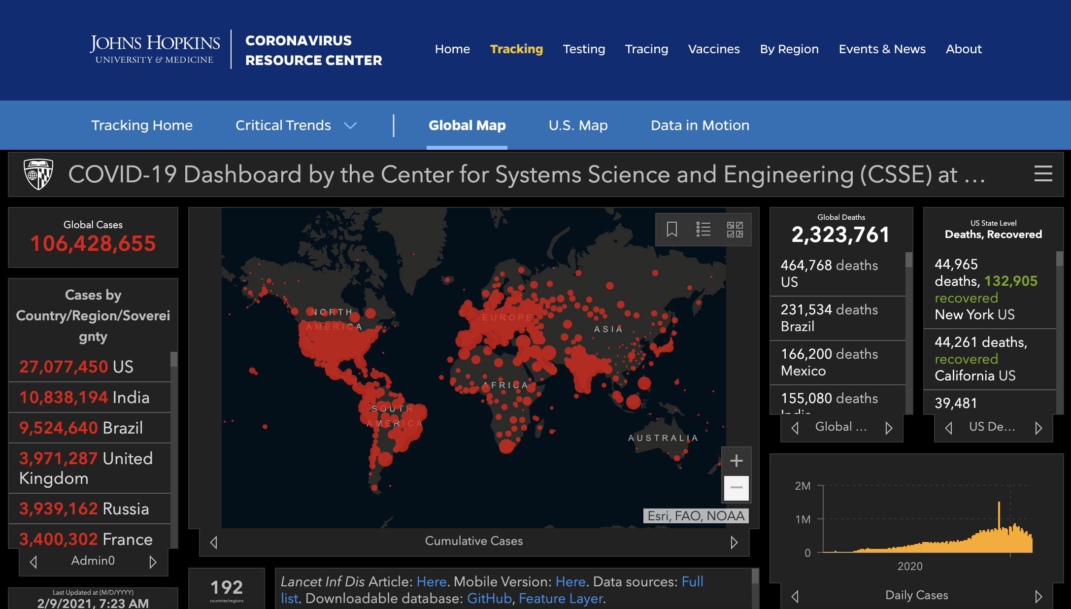 ➡️疫情肆虐全球至少 #192国/地区,截至今早8.23am,美国约翰斯·霍普金斯大学实时统计:全球累计确诊病例106,428,655例,累计死亡2,323,761例。