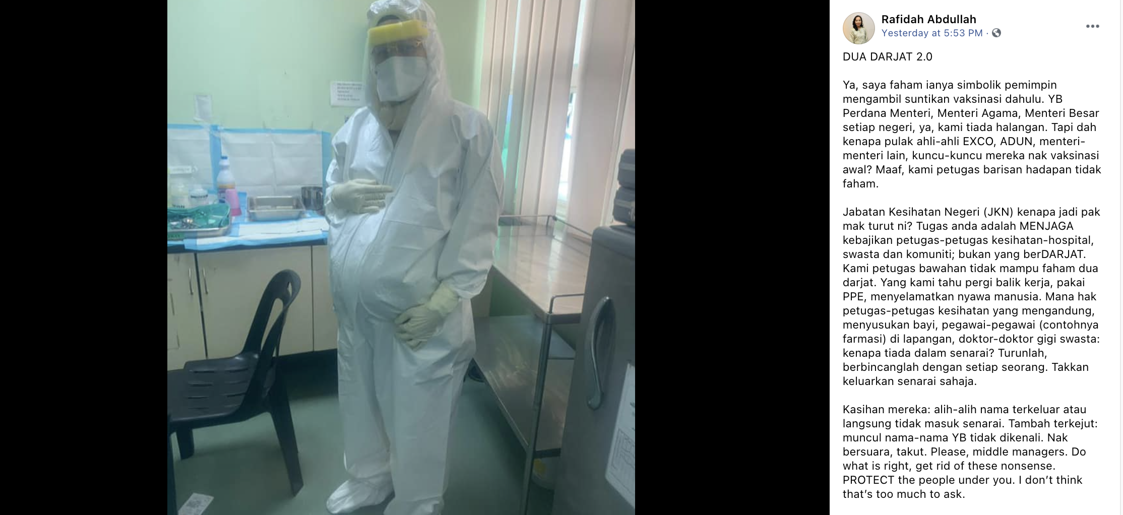➡️布城医院内科和肾脏科顾问医生拉菲达阿都拉面子书发文批评政府让政治人物先于前线医护接种,认为此举让前线很“不明白”,指州卫生局的责任,是照顾医院,私人医院,和社区医疗人员福利,而不是‘高阶人士’。