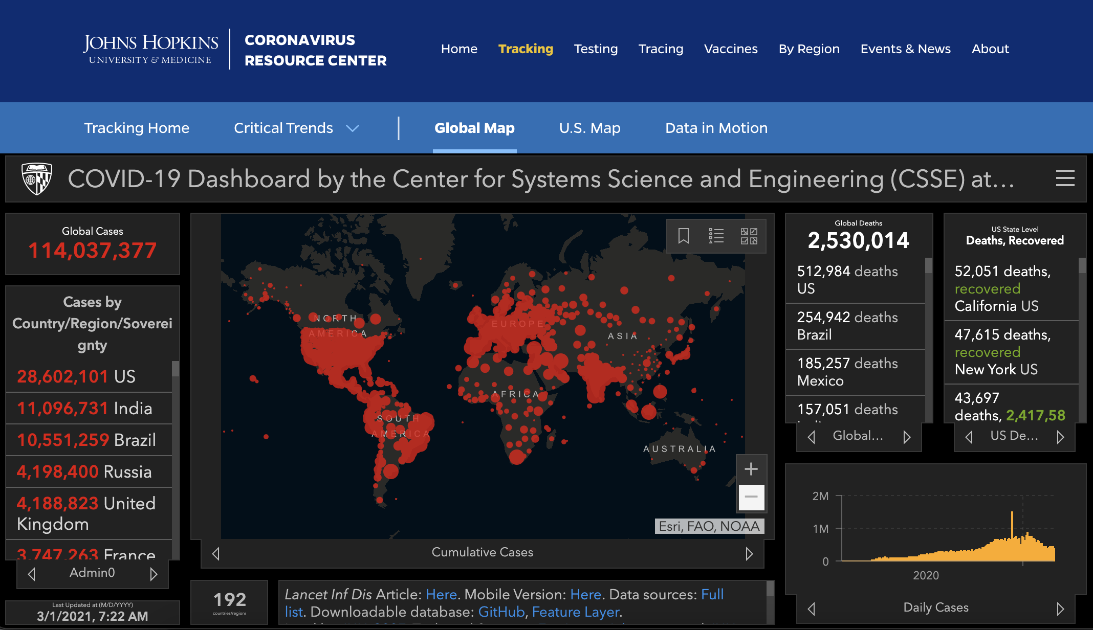 ➡️疫情肆虐全球至少 #192国/地区,截至今早7.22am,美国约翰斯·霍普金斯大学实时统计:全球累计确诊病例114,037,377例,累计死亡2,530,014例。