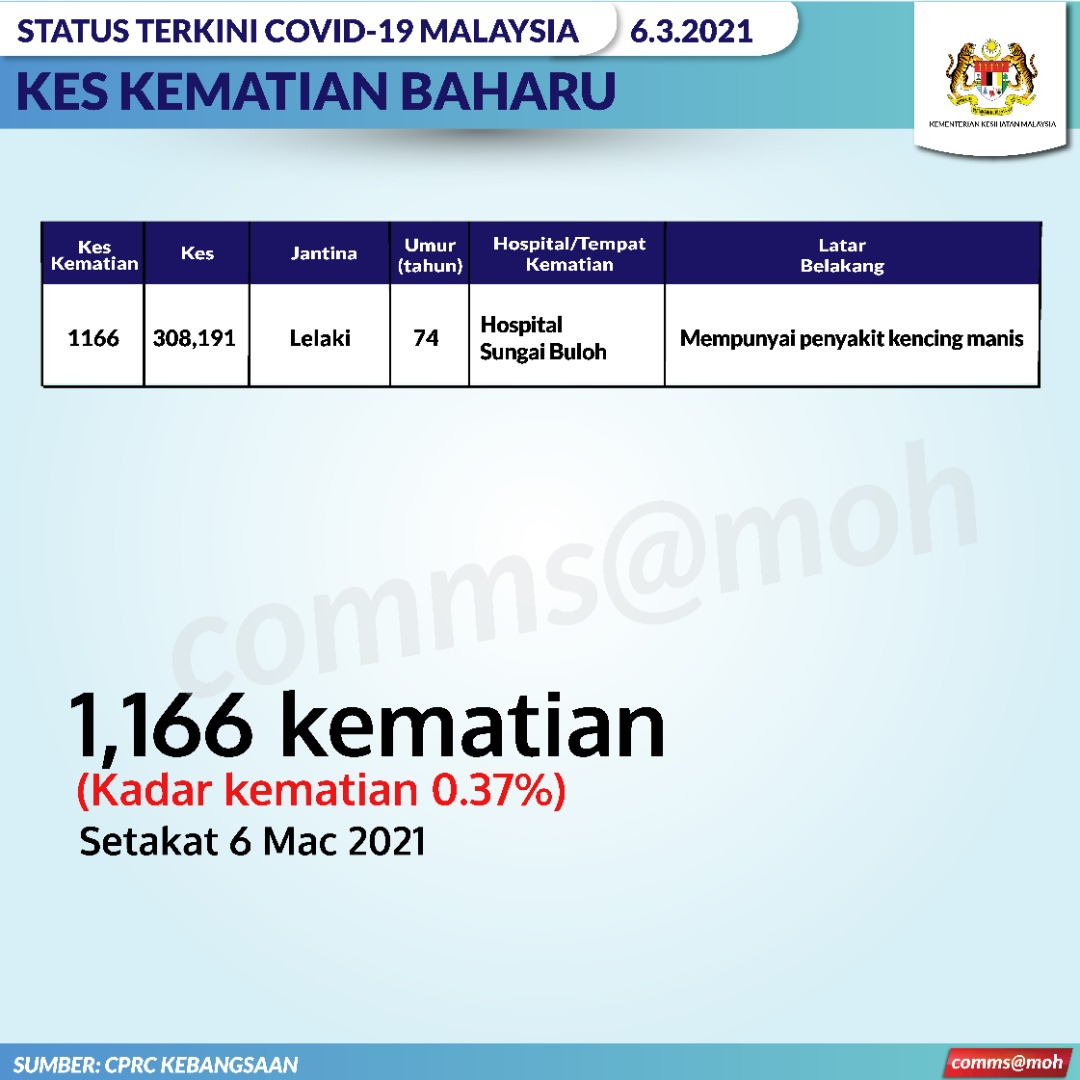 May be an image of text that says "æ冠肺炎 (Covid-19) 今日数据 CORONA CORONAVIRSD19 VIRUS (source MOH) 988 PyN MAR 6 SARAWAK 221 1680 å—®— SELANGOR 826 N.SEMBILAN P.PINANG 84 JOHOR 139 + TERENGGANU 22 PAHANG PERAK 68 SABAH KEDAH * KELANTAN 35 MELAKA 10 PUTRAJAYA 2 LABUAN PERLIS 确诊 TOTAL TOTALCASES 活跃 ACTIVECASES 21159 死亡 TOTAL DEATHS 311777 宗 1166 宗 治愈 RECOVERED CASES 289452 +7 宗 2548 å®"