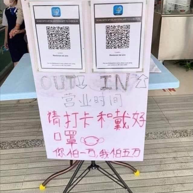 网络流传有店家在店前的告示牌上写著“请打卡(扫描MySejahtera)及戴好口罩,你怕一万,我怕五万”,提醒公众必须遵守SOP。