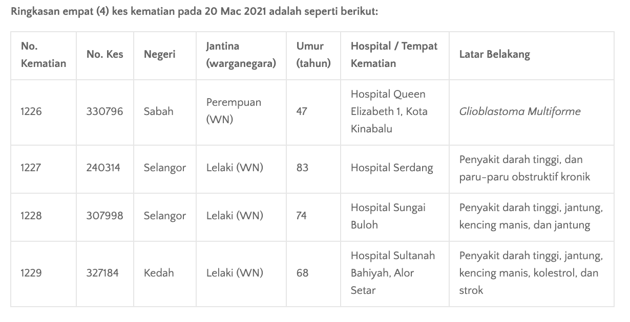 📌今天有4人死,分别来自沙巴(1)、雪兰莪(2)及吉打(1)。死者资料如下: