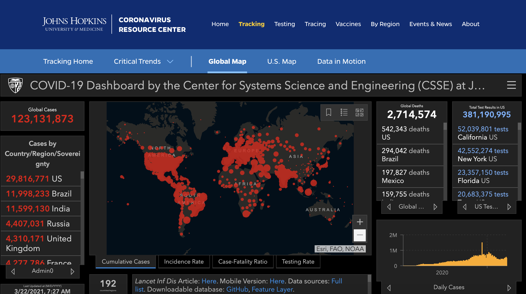 ➡️疫情肆虐全球至少 #192国/地区,截至今早7.26am,美国约翰斯·霍普金斯大学实时统计:全球累计确诊病例123,131,873例,累计死亡2,714,574例。