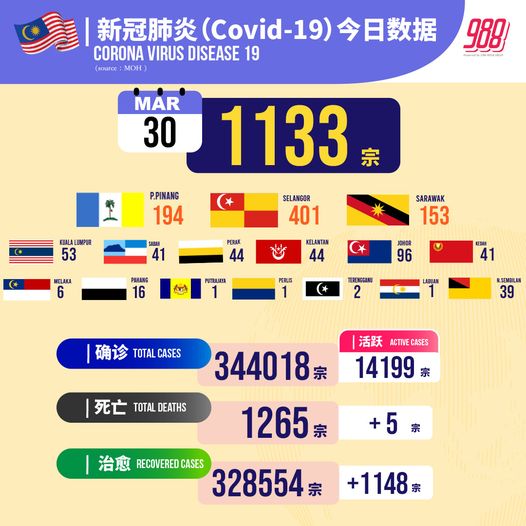 卫生部通报,截至30日12pm,我国新增 # 1133例,累计病例至今 # 344,018宗, 新增5死累计#1265死。