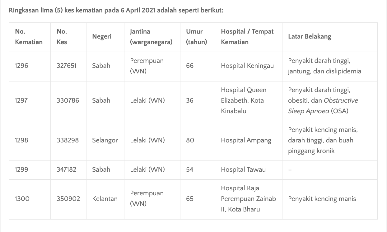 📌今天有5人死,分别来自雪州(1)、沙巴(3)及丹州(1)。死者资料如下: