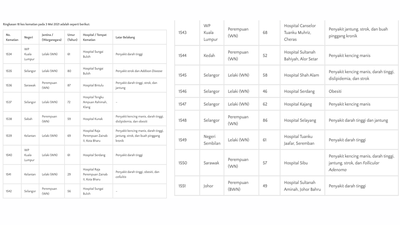 📌今天有18人死,分别来自吉隆坡(3)、雪兰莪(7)、砂拉越(2)、沙巴(1)、柔佛(1)、森州(1)、吉打(1)及丹州(2)。死者资料如下: