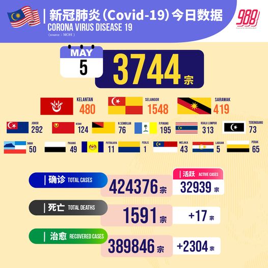卫生部通报,截至5日12pm,我国新增 #3744例,累计病例至今 # 424,376 宗,新增17死累计#1591死。