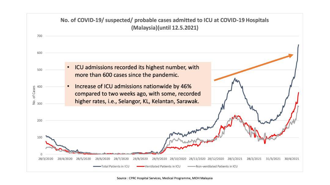 他说,全国进入ICU的人数比两周前增加46%,其中,雪、隆、丹和砂拉越增幅较高,截至5月12日,重症病患有641人,469人是冠病患者,244人需借助呼吸器,这也是疫情爆发至今,ICU最多人的记录。