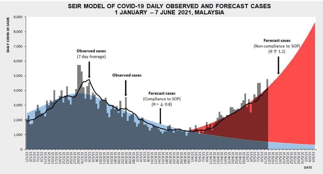 根据卫部的传染病动力学模型(SEIR)推算图,倘若基染数升回1.2,到了6月,单天新增或介于8000宗以上的水平,若是能压到1.0至0.8左右,6月就有望压平曲线至三位数。