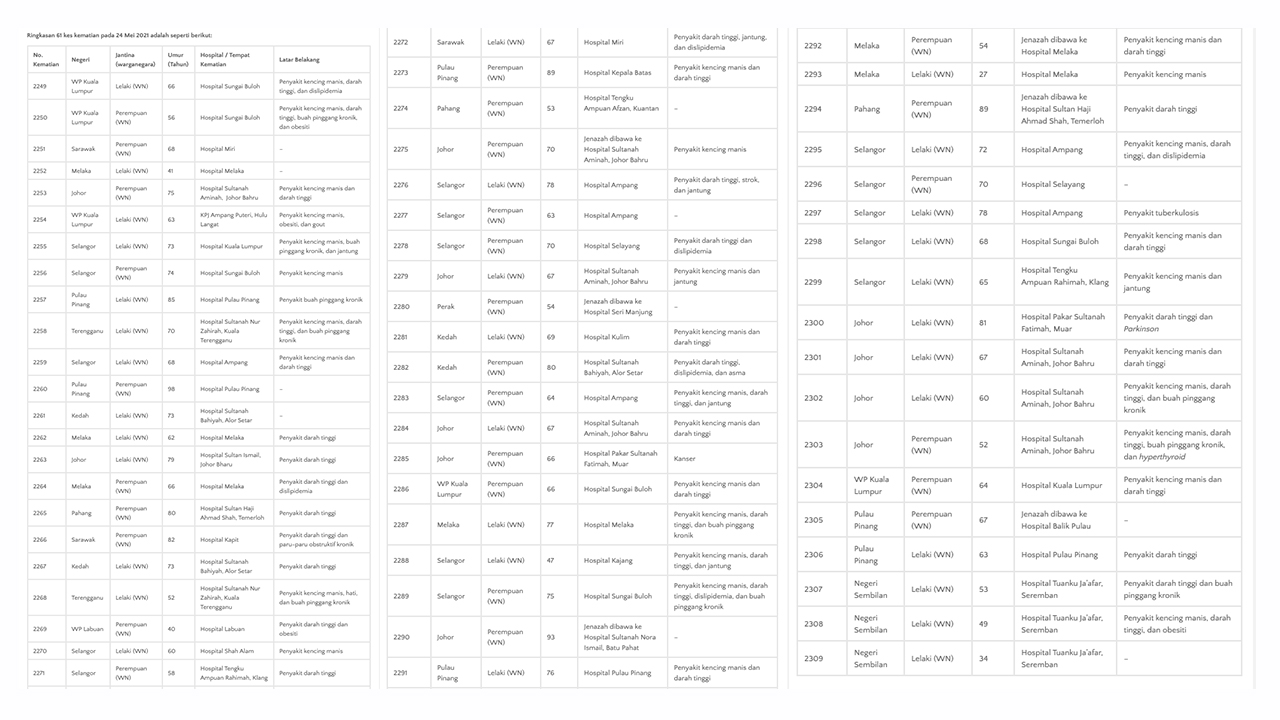 📌今天有61人死,分别来自雪兰莪(16)、柔佛(11)、槟城(6)、马六甲(6)、吉隆坡(5)、吉打(4)、砂州(3)、森州(3)、彭亨(3)、登州(2)、霹雳(1)、纳闽(1)。死者资料如下:
