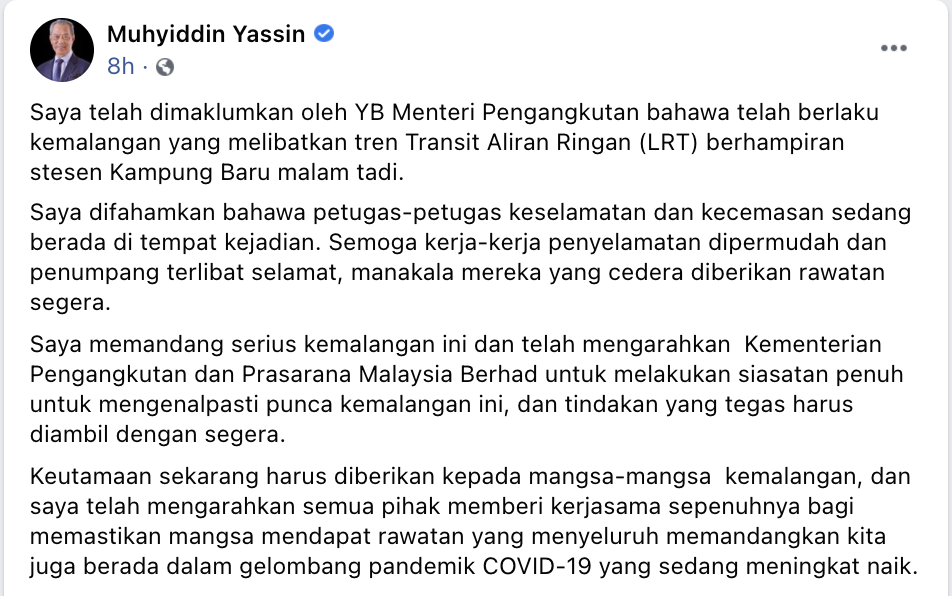 对此,首相慕尤丁也非常关注,他在个人官方脸书上表示自己非常重视,并已指示交通部及国家基建公司(Prasarana)即刻彻查。