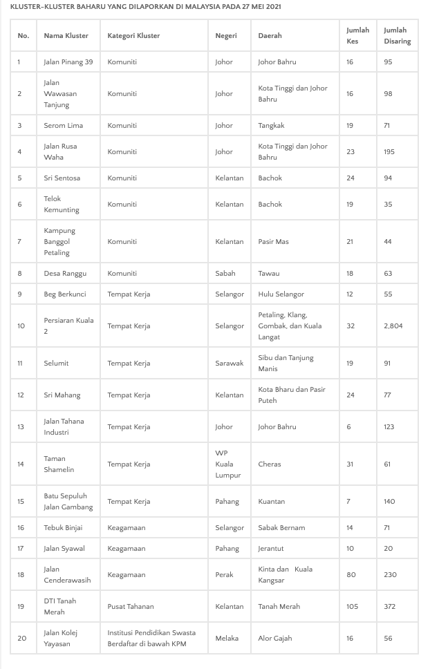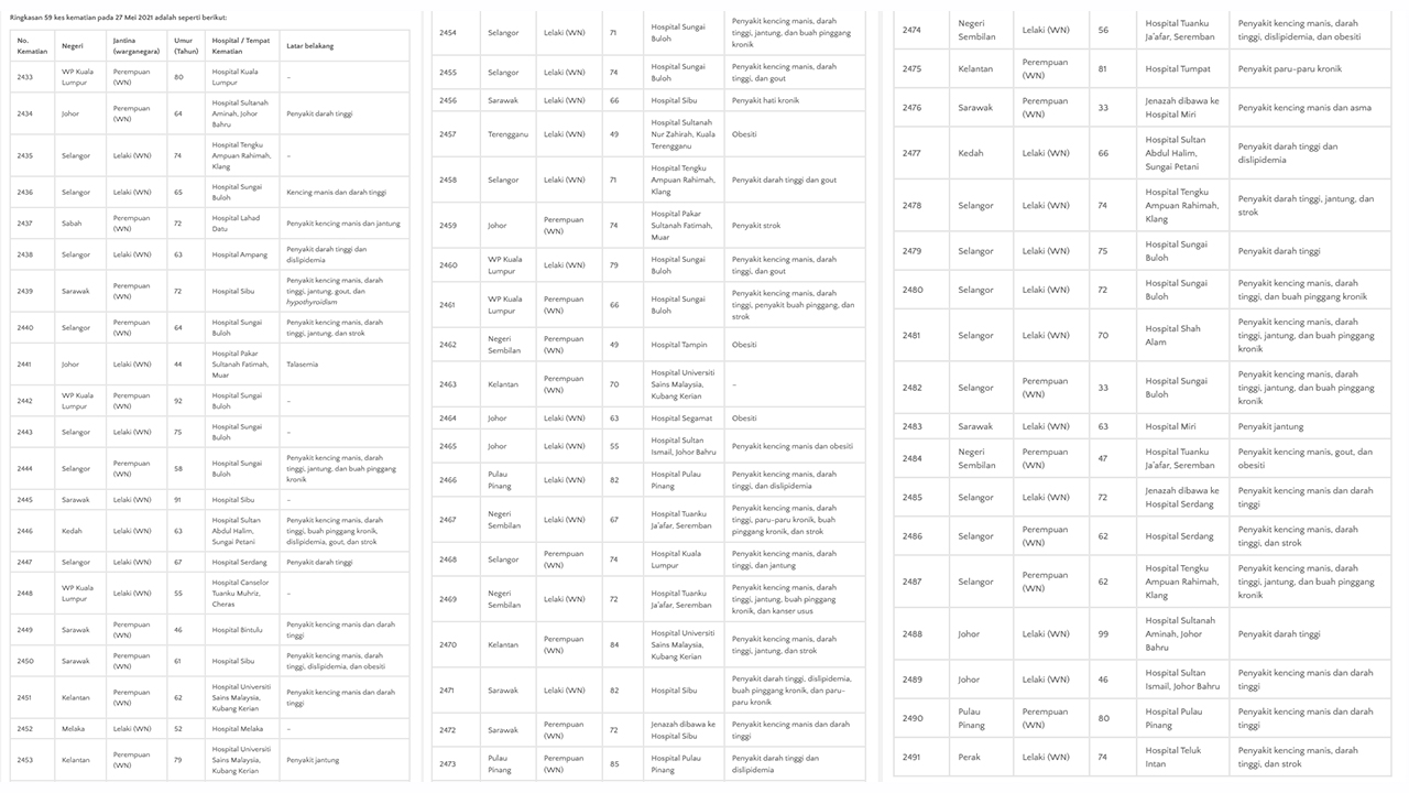 📌今天有59人死,分别来自雪兰莪(19)、砂州(9)、柔佛(7)、吉隆坡(6)、丹州(5)、森州(4)、槟城(3)、吉打(2)、沙巴(1)、甲州(1)、霹雳(1)及登州(1)。死者资料如下: