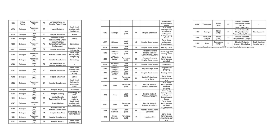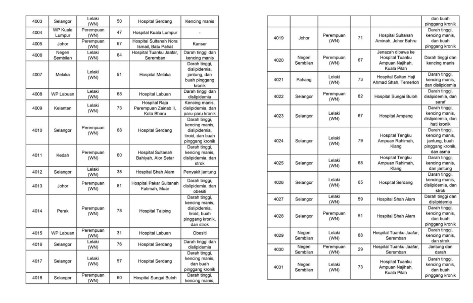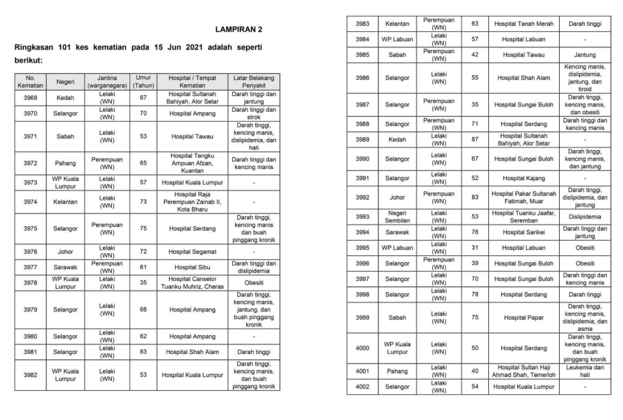 📌今天有101人死,分别来自雪兰莪(50)、吉隆坡(11)、柔佛(10)、森州(8)、纳闽(4)、沙巴(3)、彭亨(3)、丹州(3)、吉打(3)、砂州(2)、槟城(1)、甲州(1)、登州(1)及霹雳(1)。死者资料如下: