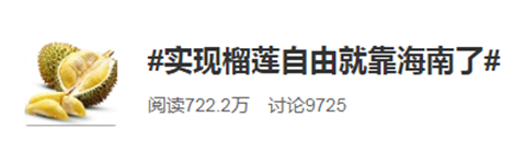 因为过度依赖入口,榴梿国产化的呼声随着榴莲进口价格而高涨,希望实现榴梿自由,在微博上还掀起 #实现榴梿自由就靠海南了# 的讨论。