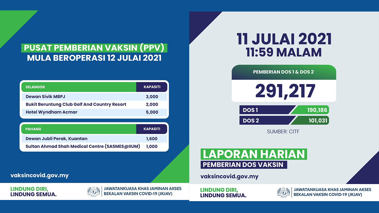 另一方面,全民接种疫苗计划全面进行中,从今日起,雪兰莪及彭亨共有5个全新的疫苗接种中心(PPV)启用,以增加单天接种量,加速达致全民免疫目标。