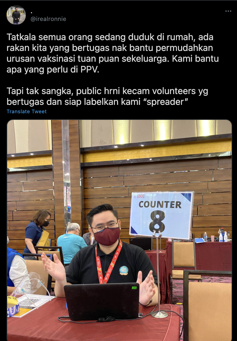 在IDCC值勤署名“irealronnie”的志工,在自己的推特发言说,他们在申请当志工时,都知道会面对包括被感染的风险,但他们依然愿意为民服务;但一些人批评志工是‘播毒者’,对志工们真的很不公平。