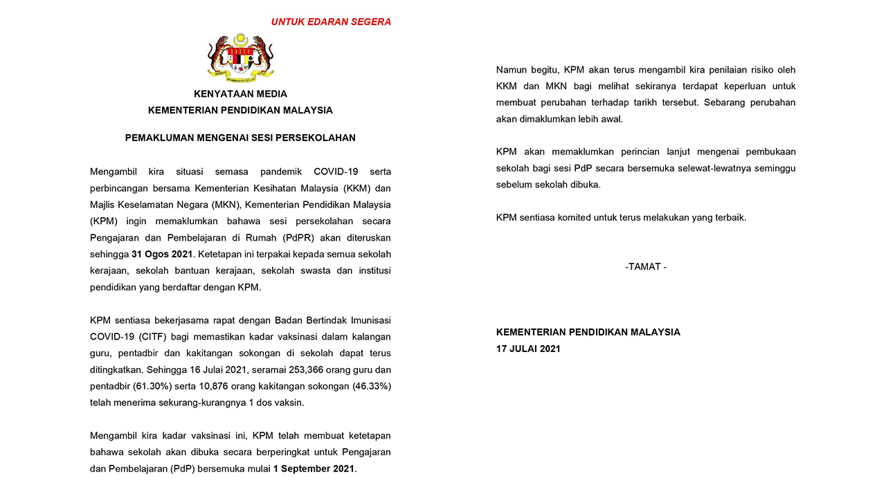 鉴于疫情高企不下,教育部宣布,居家线上学习模式将会再度延长至8月31日,9月起才分阶段返校!