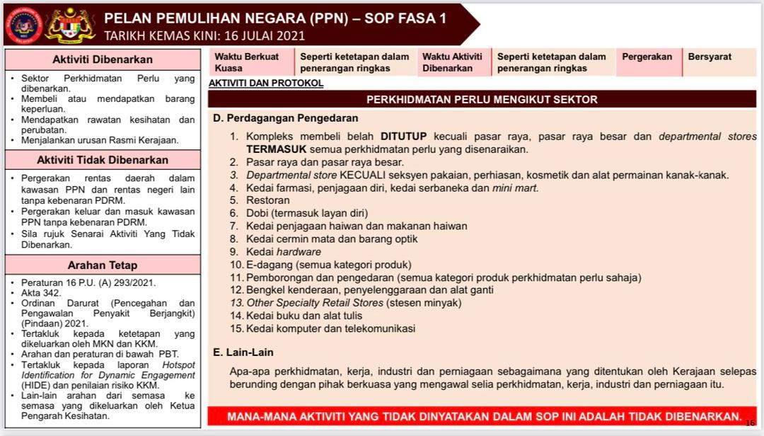 雪州34副县EMCO如期结束后,意即雪州从今天开始重回国家复苏计划第一阶段(PPN Fasa1)的行动管制,国安会漏夜更新全新SOP, 其中包括仍禁跨县跨州、允2人一车、熟食餐馆可10pm打烊、早市可开、不过,之前允许作业的百货公司(department store)的服装、装饰、化妆品和儿童玩具区,重列禁开名单!