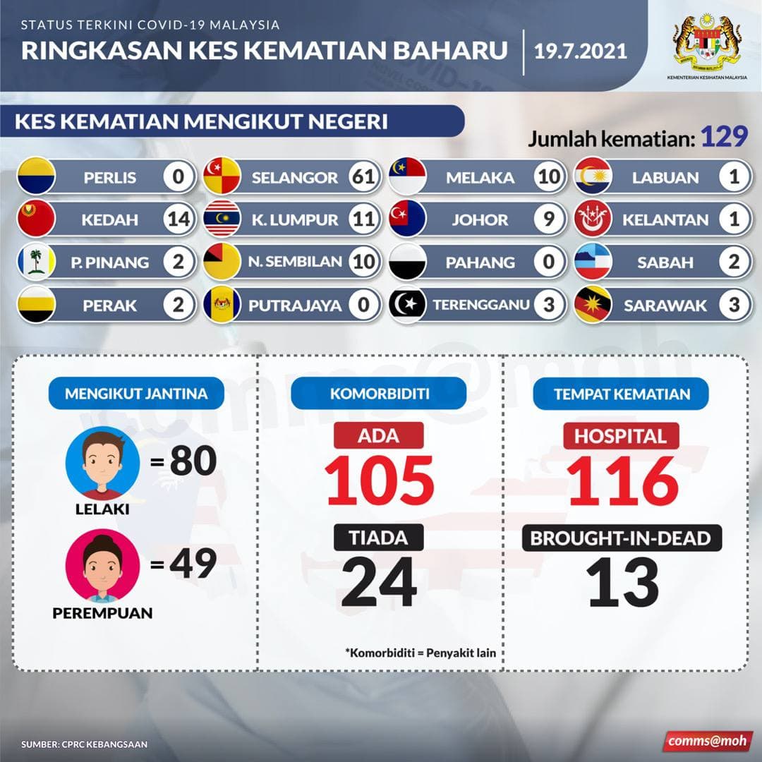 📌今天有129人死,分别来自雪兰莪(61)、吉打(14)、吉隆坡(11)、森州(10)、甲州(10)、柔佛(9)、砂州(3)、登州(3)、沙巴(2)、槟城(2)、霹雳(2)、丹州(1)、纳闽(1)。死者资料如下: