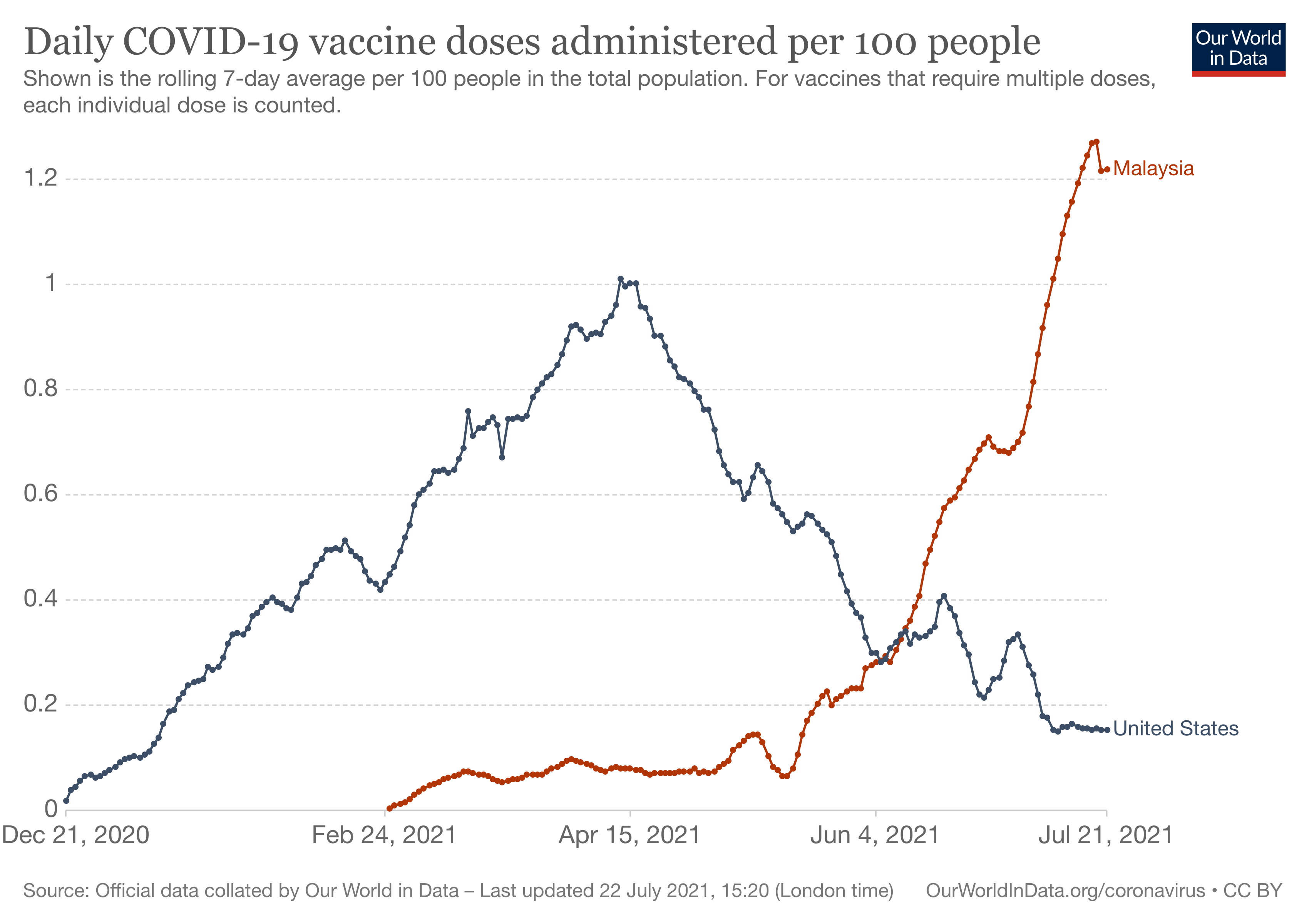 根据该网站,马来西亚于7月19日,每100人的单日疫苗接种率达到1.27位;此数据高于美国于 4 月 13 日达到每 100 人接种 1.01 剂疫苗的峰值。