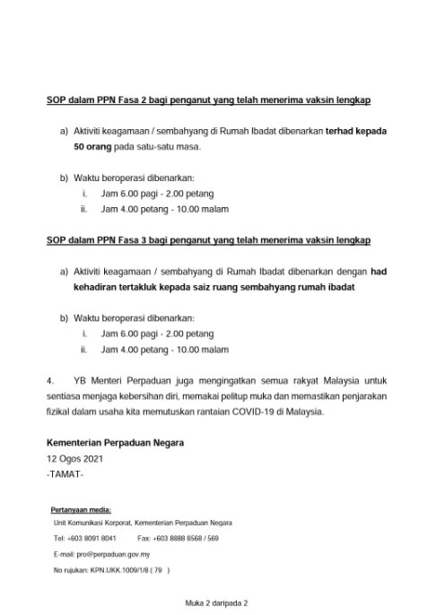 国家团结部再调整非穆斯林宗教场所SOP,允许国家复苏计划第一和第二阶段的宗教活动50人出席,至于第三阶段的人数则根据宗教场所面积大小而定。