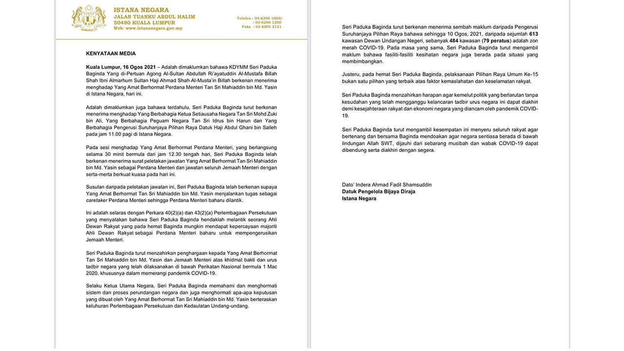 国家皇宫发表声明,慕尤丁是在今午12时30分觐见元首,历时30分钟会面中,陛下已接受慕尤丁及内阁总辞的辞职信。