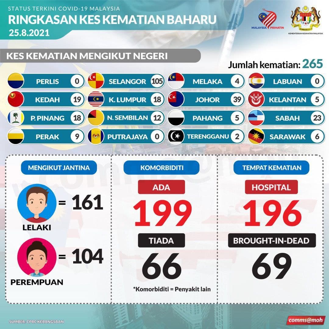 📌今天有265死,分别来自雪州(105)、柔佛(39)、沙巴(23)、吉打(19)、槟城(18)、吉隆坡(18)、森州(12)、霹雳(9)、砂州(6)、彭亨(5)、丹州(5)、甲州(4)、登州(2)
