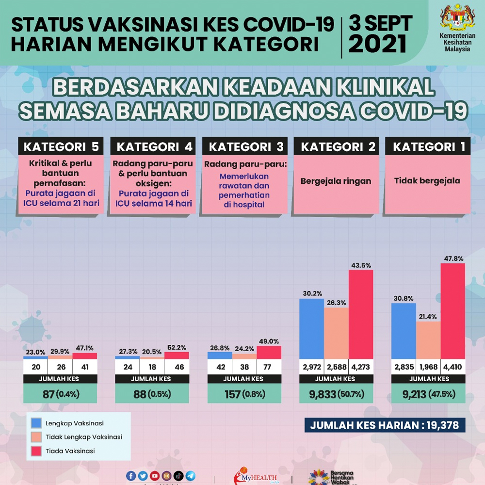 May be an image of one or more people and text that says "STATUS TERKINI COVID- 19 MALAYSIA RINGKASAN KES KEMATIAN BAHARU 3.9.2021 KES KEMATIAN MENGIKUT NEGERI PRIHATIN แบบส.งยสดสมนสรม PERLIS KEDAH SELANGOR 148 21 Jumlah kematian: 330 κ. LUMPUR MELAKA P. PINANG 11 38 LABUAN JOHOR N.SEMBILAN PERAK 15 KELANTAN 11 PAHANG PUTRAJAYA SABAH 35 TERENGGANU MENGIKUT JANTINA SARAWAK 6 KOMORBIDITI TEMPAT KEMATIAN 189 LELAKI ADA 264 HOSPITAL 237 141 PEREMPUAN TIADA 66 *Komorbiditi Penyakit lain SUMBER: BROUGHT-IN-DEAD 93 KEBANGSAAN& comms@moh"