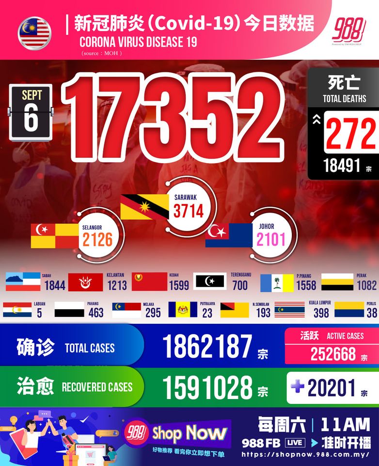 卫生部通报,截至6日12pm,我国新增 #17,352例,累计病例至今 #1,862,187宗,新增272死,累计死亡18,491宗。