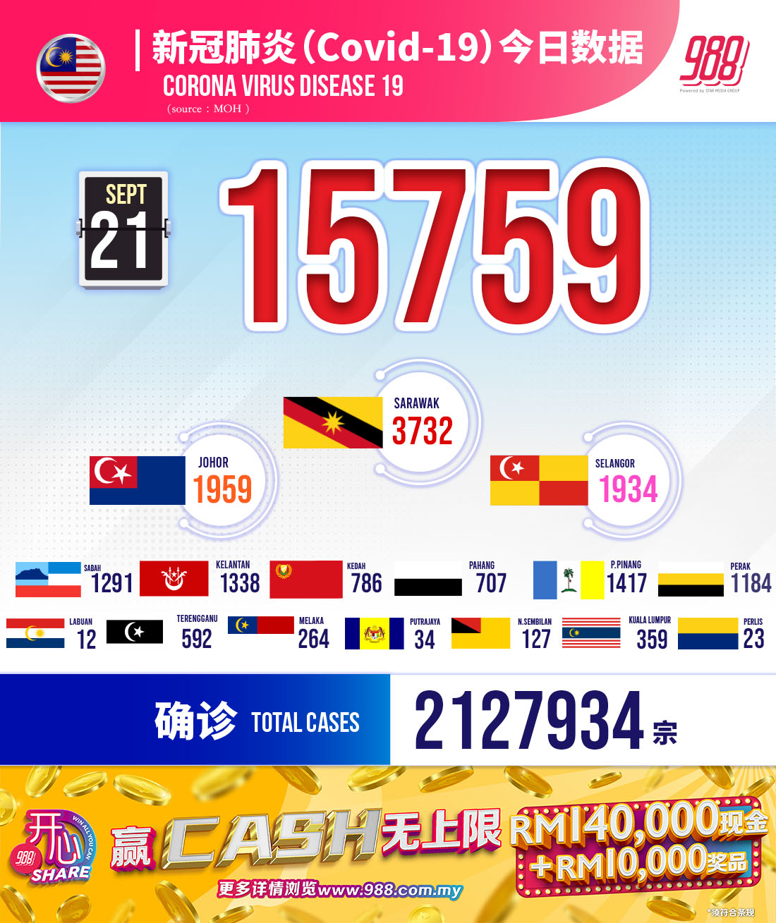 卫生部通报,截至21日12pm,我国新增15,759例,累计病例至今2,127,934 宗。