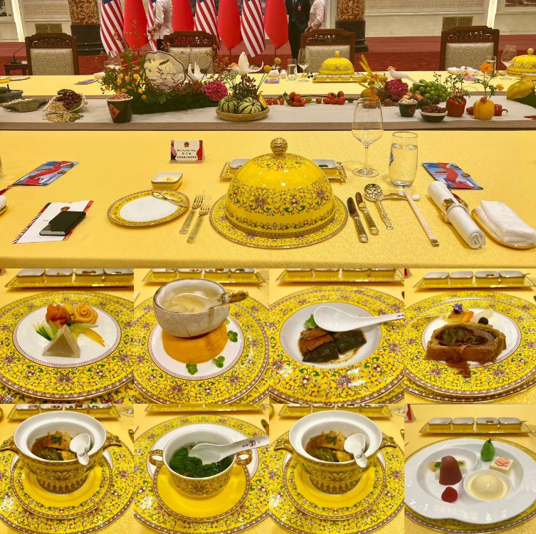 这场国宴菜式以六菜一汤精选,展现中西文化精华,佳肴包括椰香花胶汤、酥皮牛柳、葱烧海鲜、泉水鲜蔬、水煮石斑鱼、海鲜炒饭、象形梨、花蛋糕、水果、冰淇淋,以及咖啡和茶。