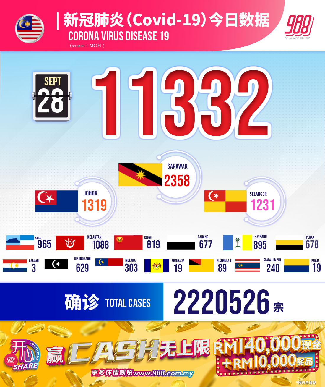 卫生部通报,截至28日12pm,我国新增 # 11,332 例,累计病例至今 #2,220,526 宗。