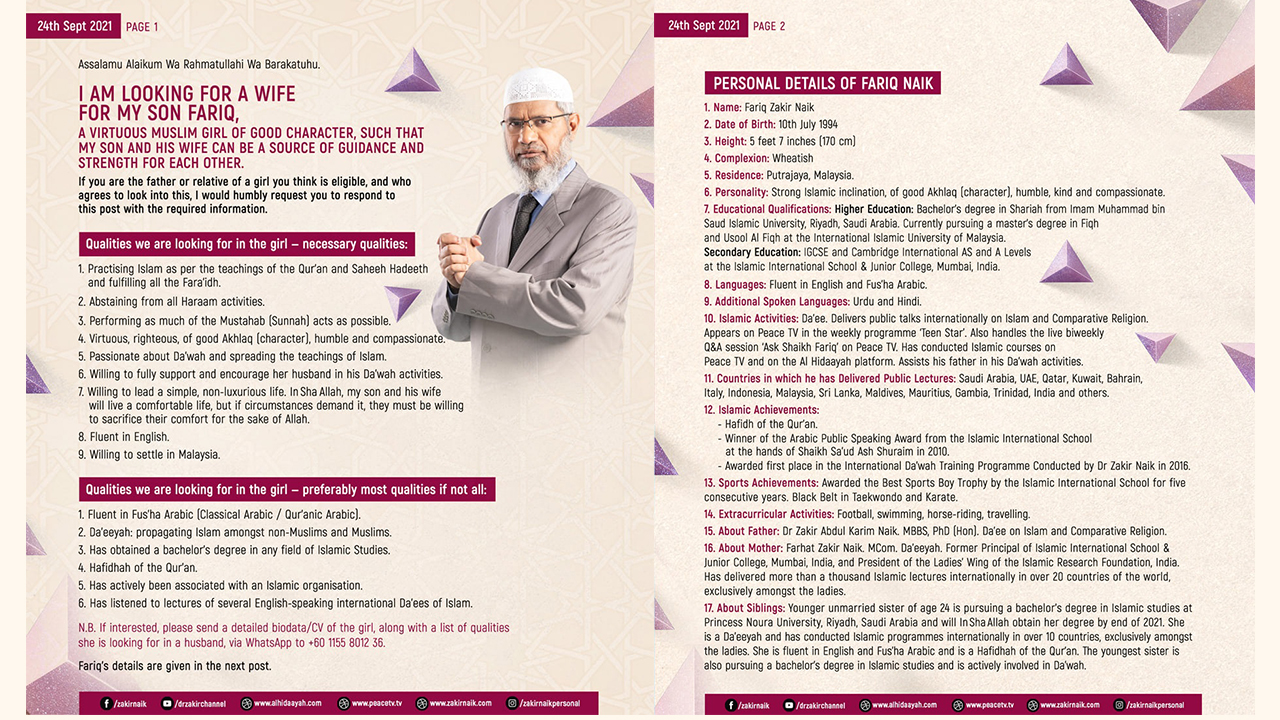 备受争议的印度籍伊斯兰传教士扎基尔(Zakir Naik)脸书公开“征媳”,列出了9大要求替目前人在大马的儿子法力克找老婆!